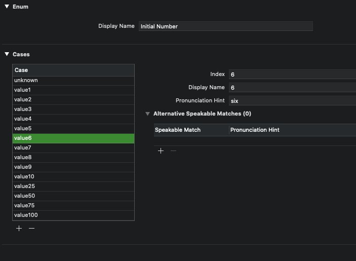 For each possible number we have a case .value<x> with an index matching our number. You’ll notice that I’ve also added a pronunciation hint. I’m not sure this is needed as I hope Siri can pronounce numbers!